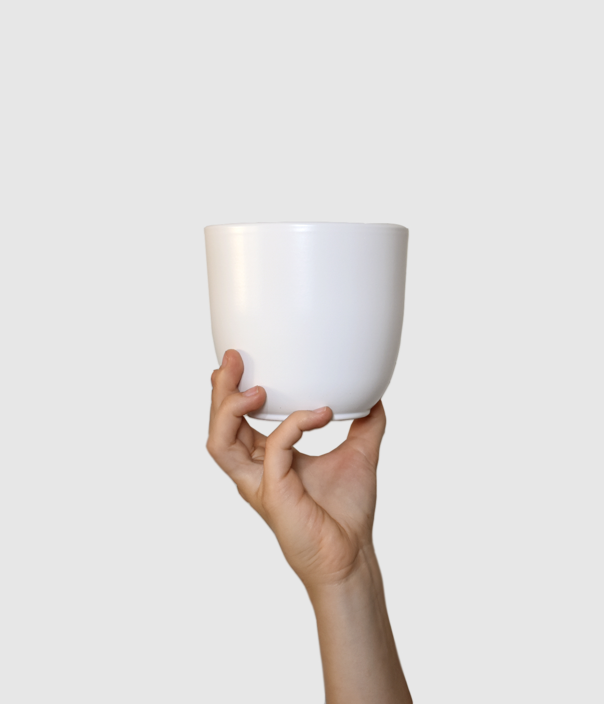 Clasic matt white decorative pot pairs perfectly with plants in plastic pots measuring 8–9 cm in diameter.